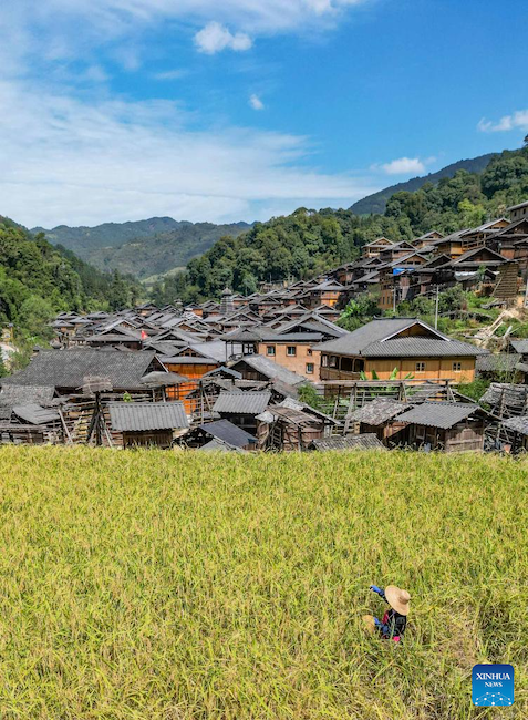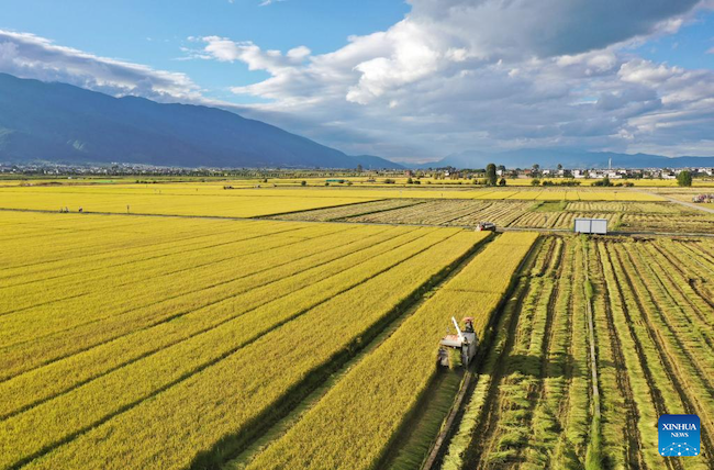 Αεροφωτογραφ?α που τραβ?χτηκε στι? 8 Οκτωβρ?ου του 2022, δε?χνει ?ναν χωρικ? να συλλ?γει ρ?ζι στην κωμ?π?λη Γουαντσι?ο τη? π?λη? Νταλ? στην αυτ?νομη νομαρχ?α Νταλ? Μπ?ι, στην επαρχ?α Γιουν?ν τη? νοτιοδυτικ?? Κ?να?. (Φωτογραφ?α: Liang Zhiqiang/Xinhua)