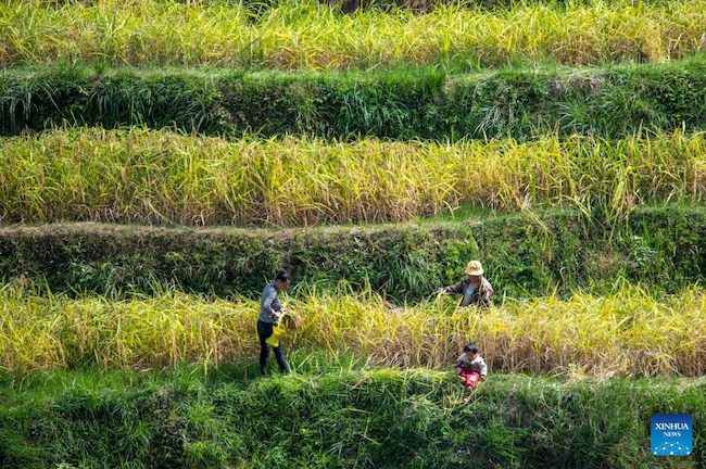 Οι χωρικο? συγκομ?ζουν ρ?ζι στην κωμ?πολη Μπινγκμ?ι τη? κομητε?α? Τσονγκτζι?νγκ, στην επαρχ?α Γκουε?τζ?ου τη? νοτιοδυτικ?? Κ?να?, 10 Οκτωβρ?ου 2022. (Φωτογραφ?α: Wu Dejun/Xinhua)