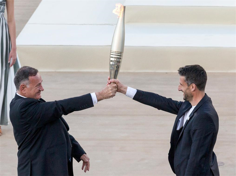 Στι? 26 Απριλ?ου, ο πρ?εδρο? τη? Ελληνικ?? Ολυμπιακ?? Επιτροπ?? Καπρ?λο? (αριστερ?) παραδ?δει την δ?δα στον πρ?εδρο τη? Οργανωτικ?? Επιτροπ?? των Ολυμπιακ?ν Αγ?νων του Παρισιο? Estanguet. |