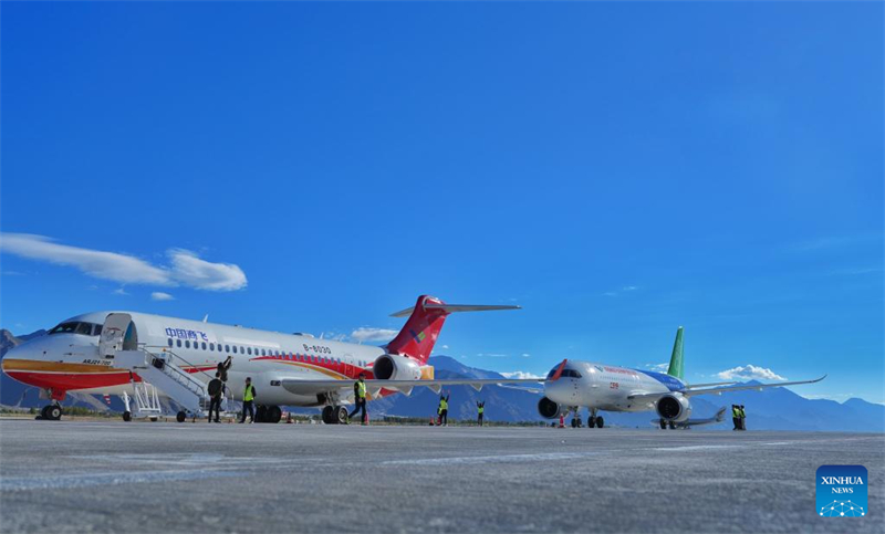 | ?να επιβατικ? αεροσκ?φο? C919 (δεξι?) σταθμε?ει δ?πλα σε ?να αεροσκ?φο? ARJ21 στο Διεθν?? Αεροδρ?μιο Λ?σα Γκονγκγκ?ρ στη π?λη Λ?σα τη? Αυτ?νομη? Περιοχ?? Σιζ?νγκ, στι? 19 Σεπτεμβρ?ου. (Φωτογραφ?α / Xinhua) |