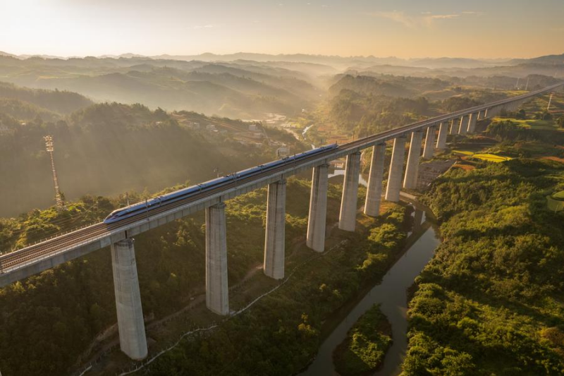 Αεροφωτογραφ?α στι? 31/8/2023 εν?? τρα?νου-οβ?δα (bullet train) στη γ?φυρα Γινπ?χε (Yinpohe) στην επαρχ?α Γκουιτζο?, Xinhua