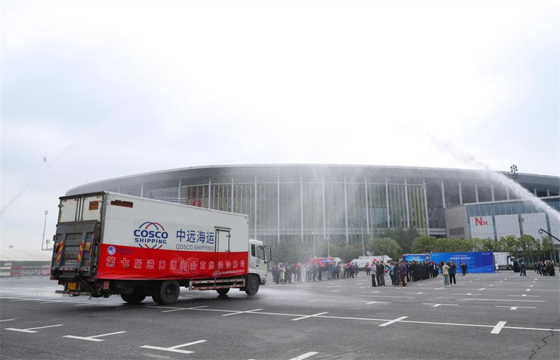 ?να φορτηγ? γεμ?το εκθ?ματα για την επερχ?μενη 7η Διεθν? ?κθεση Εισαγωγ?ν τη? Κ?να? (CIIE) υποδ?χεται μια υδ?τινη υποδοχ? κατ? τη δι?ρκεια μια? τελετ?? υποδοχ?? εκθεμ?των στο Εθνικ? Κ?ντρο Εκθ?σεων και Συνεδρ?ων (Σαγκ?η), την κ?ρια τοποθεσ?α για την CIIE, στην ανατολικ? Κ?να, Σαγκ?η, 22 Οκτωβρ?ου 2024. Φωτογραφ?α: Xinhua