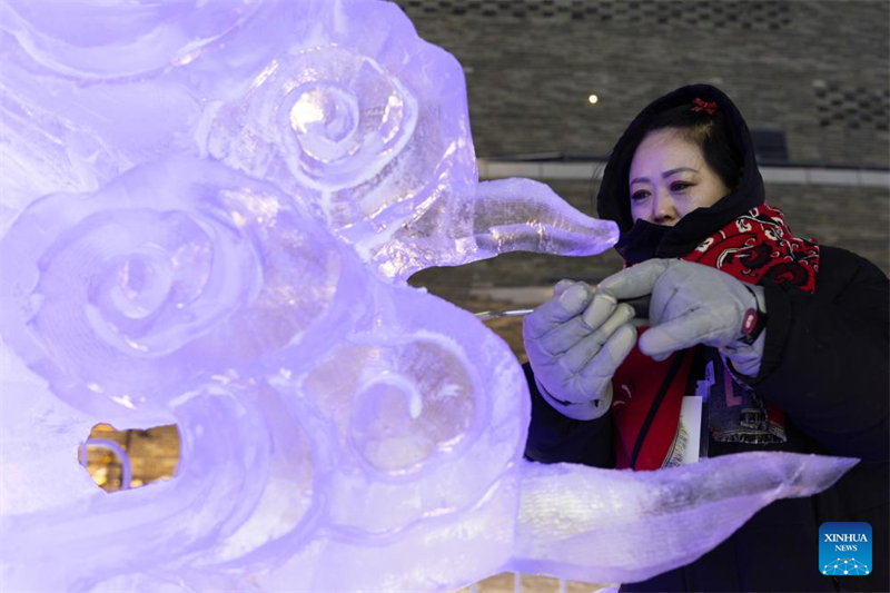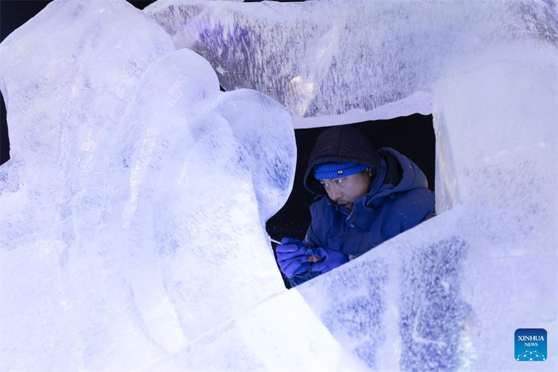 Διαγωνιζ?μενη εργ?ζεται π?νω σε ?να γλυπτ? απ? π?γο κατ? τη δι?ρκεια του πρ?του Διαγωνισμο? Επαγγελματικο? Σκαλ?σματο? Π?γου τη? Χειλονγκτζι?νγκ στο Harbin Ice-Snow World, στην π?λη Χαρμπ?ν τη? β?ρεια? Κ?να?, στι? 15 Ιανουαρ?ου 2025. (Φωτογραφ?α / Xinhua) |