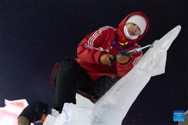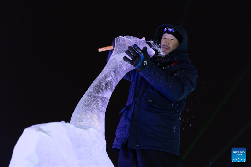 Διαγωνιζ?μενο? εργ?ζεται π?νω σε ?να γλυπτ? απ? π?γο κατ? τη δι?ρκεια του πρ?του Διαγωνισμο? Επαγγελματικο? Σκαλ?σματο? Π?γου τη? Χειλονγκτζι?νγκ στο Harbin Ice-Snow World, στην π?λη Χαρμπ?ν τη? β?ρεια? Κ?να?, στι? 15 Ιανουαρ?ου 2025. (Φωτογραφ?α / Xinhua) |