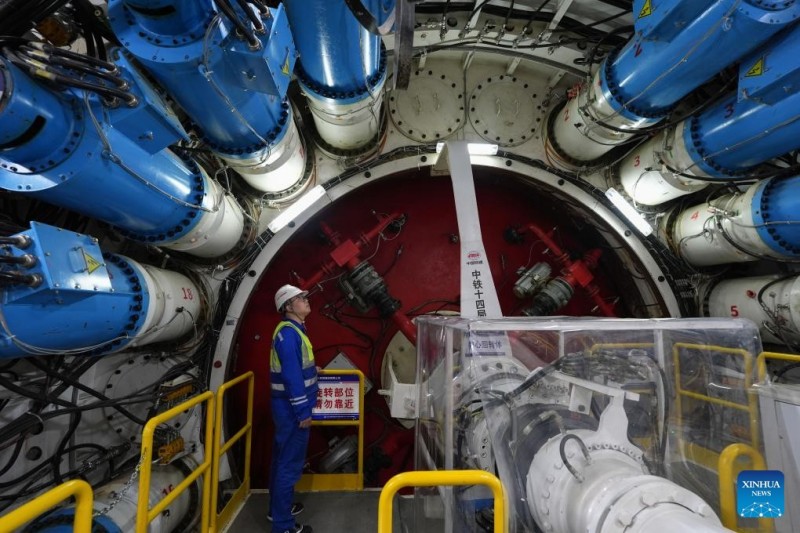 | ?να? τεχνικ?? απ? την China Railway 14th Bureau Group Co., Ltd. ελ?γχει τη λειτουργ?α τη? μηχαν?? δι?νοιξη? σηρ?γγων "Yongzhou" στην υποθαλ?σσια σ?ραγγα Jintang τη? σιδηροδρομικ?? γραμμ?? Ningbo-Zhoushan στην επαρχ?α Zhejiang, ανατολικ? Κ?να, στι? 25 Φεβρουαρ?ου 2025. |