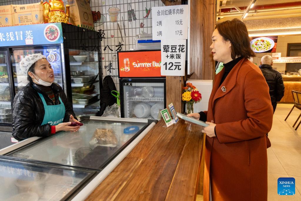 Η Wu Chengli ενημερ?νεται για τη λειτουργ?α εν?? κοινοτικο? εστιατορ?ου στην Κοιν?τητα του Χωριο? Minzhu, στην υποπεριοχ? Xiejiawan τη? Περιοχ?? Jiulongpo, στη νοτιοδυτικ? Τσονγκτσ?νγκ, στι? 25 Φεβρουαρ?ου 2025.