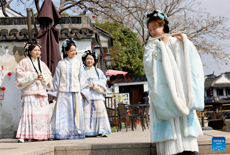 | Γυνα?κε? ντυμ?νε? με παραδοσιακ?? κινεζικ?? ενδυμασ?ε? Χ?νφου ποζ?ρουν για φωτογραφ?ε? στην αρχα?α π?λη Τζουτζιατζι?ο στη Σαγκ?η, ανατολικ? Κ?να, στι? 6 Μαρτ?ου 2025. Φωτογραφ?α / Xinhua |