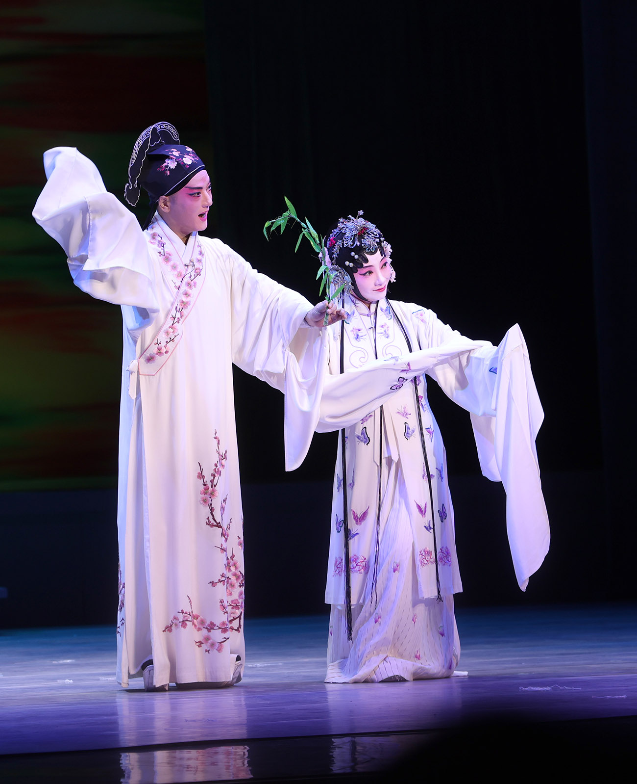 Ο ηθοποι?? τη? ?περα? Κουντσο?, Γιου Τζιουλ?ν, και η ηθοποι?? Σεν Φενγκ?νγκ, που ερμηνε?ουν του? ρ?λου? του Λιου Μενγκμ?ι και τη? Ντου Λινι?νγκ στη νεανικ? εκδοχ? του ?ργου, σε παρ?σταση στο Πανεπιστ?μιο του Πεκ?νου στι? 16 Σεπτεμβρ?ου 2024. Φωτογραφ?α / China Daily