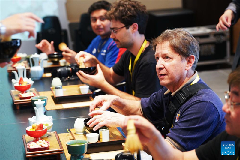 Ο Brian Alan Topolski (πρ?το? δεξι?) απολαμβ?νει ?να Τσ?ι Μπ?νκετ Jingshan στο Hangzhou, ανατολικ? επαρχ?α Zhejiang τη? Κ?να?, 27 Μαρτ?ου 2025. (Φωτογραφ?α / Xinhua)