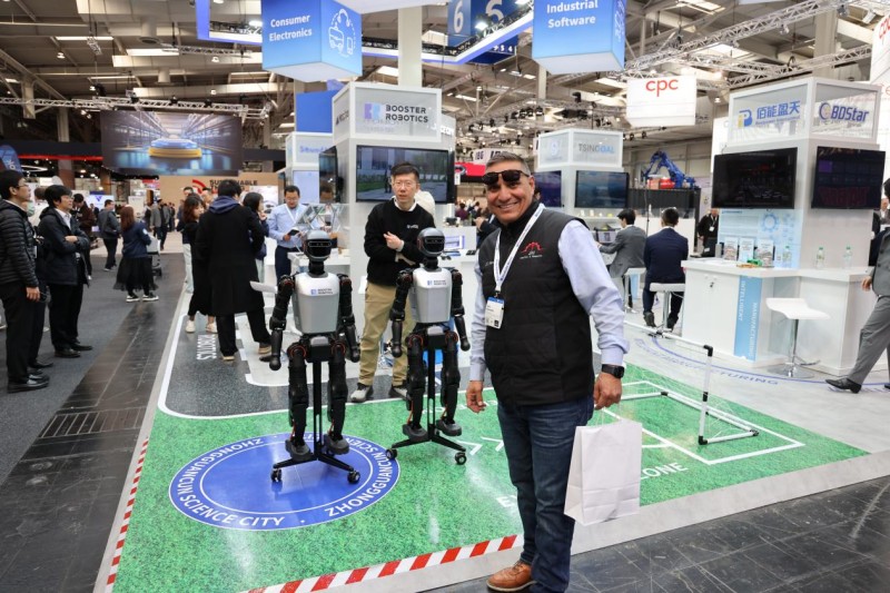?νδρα? φωτογραφ?ζεται μπροστ? απ? ανθρωποειδ? ρομπ?τ κινεζικ?? κατασκευ?? στη Διεθν? ?κθεση του Αν?βερου 2025 (Hannover Messe), μ?α απ? τι? κορυφα?ε? παγκοσμ?ω? βιομηχανικ?? εμπορικ?? εκθ?σει? με αντικε?μενο την αν?πτυξη τη? βιομηχαν?α?. (Φωτογραφ?α / Λα?κ? Ημερησ?α)