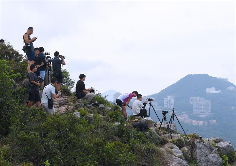 ?νθρωποι παρακολουθο?ν την ?φιξη του αεροπλανοφ?ρου Σαντ?νγκ στα ?δατα του Χονγκ Κονγκ, στι? 3 Ιουλ?ου του 2025. (Φωτογραφ?α / Xinhua)